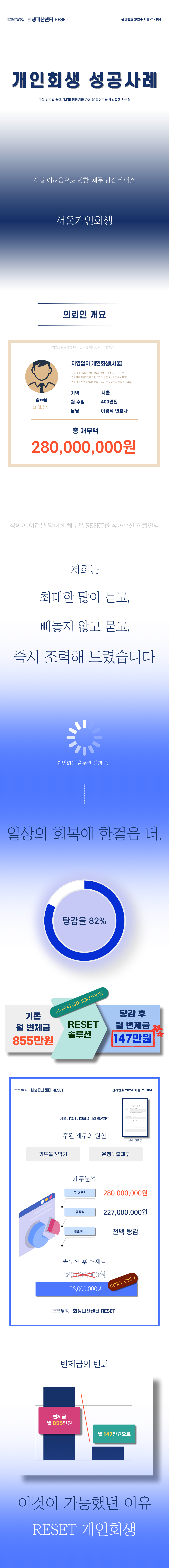 서울에서 자영업을 운영하시는 의뢰인께서는 총 280,000,000원의 채무로 인해 월 855만 원의 변제금을 감당하지 못해 고통받고 있었습니다. 그러나 창원개인회생전문 RESET 회생파산센터의 맞춤 전략을 통해 이 채무를 53,000,000원으로 감면, 월 변제금 역시 147만 원으로 조정하여 무려 82%의 채무 탕감에 성공하였습니다.